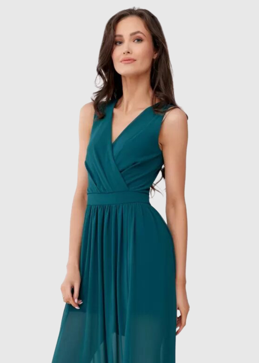 Kendra tumši zaļa gara vakarkleita ar V-veida izgriezumu