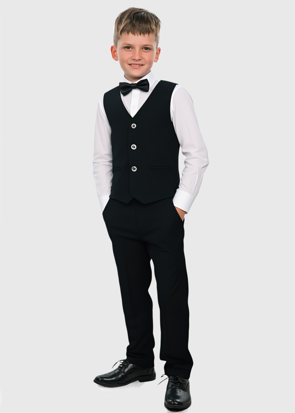 Papildus info: Bikses, žakete, krekls, veste un tauriņš iekļauta komplektā